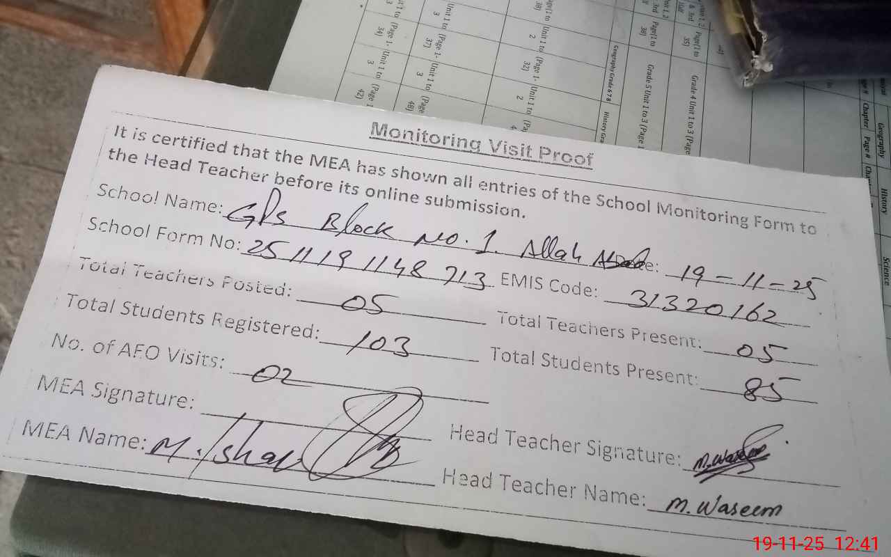 | EMIS Code: 31320162 | Name of School: GPS BLOCK NO. 1 ALLAH ABAD | |||