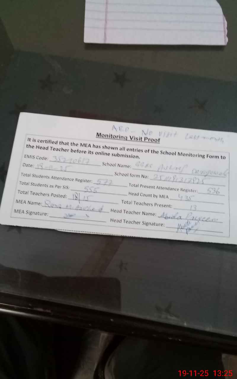 | Attendance Register | Head Teacher | MEA with School | Visit Proof |