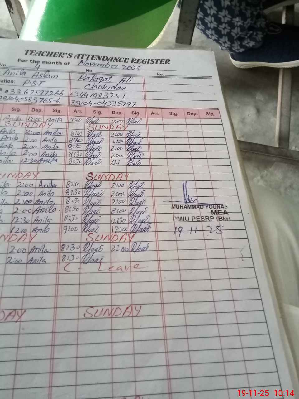 | CNIC | Full Name | Designation | R/C | Absence During Last Calender Month |