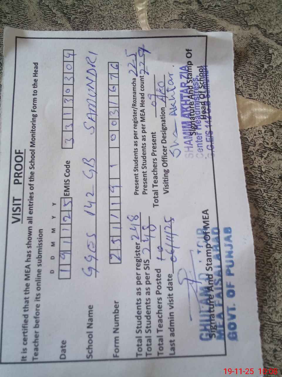 | Certified that this School was Inspected by the Undersigned MEA/DMO Today and the Information Stated Above is as Per Record. | |||||