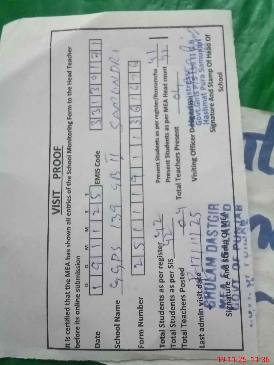 | Attendance Register | Head Teacher | MEA with School | Visit Proof |