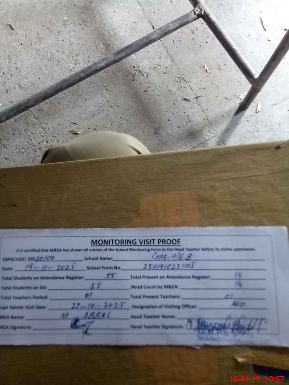 | Attendance Register | Head Teacher | MEA with School | Visit Proof |