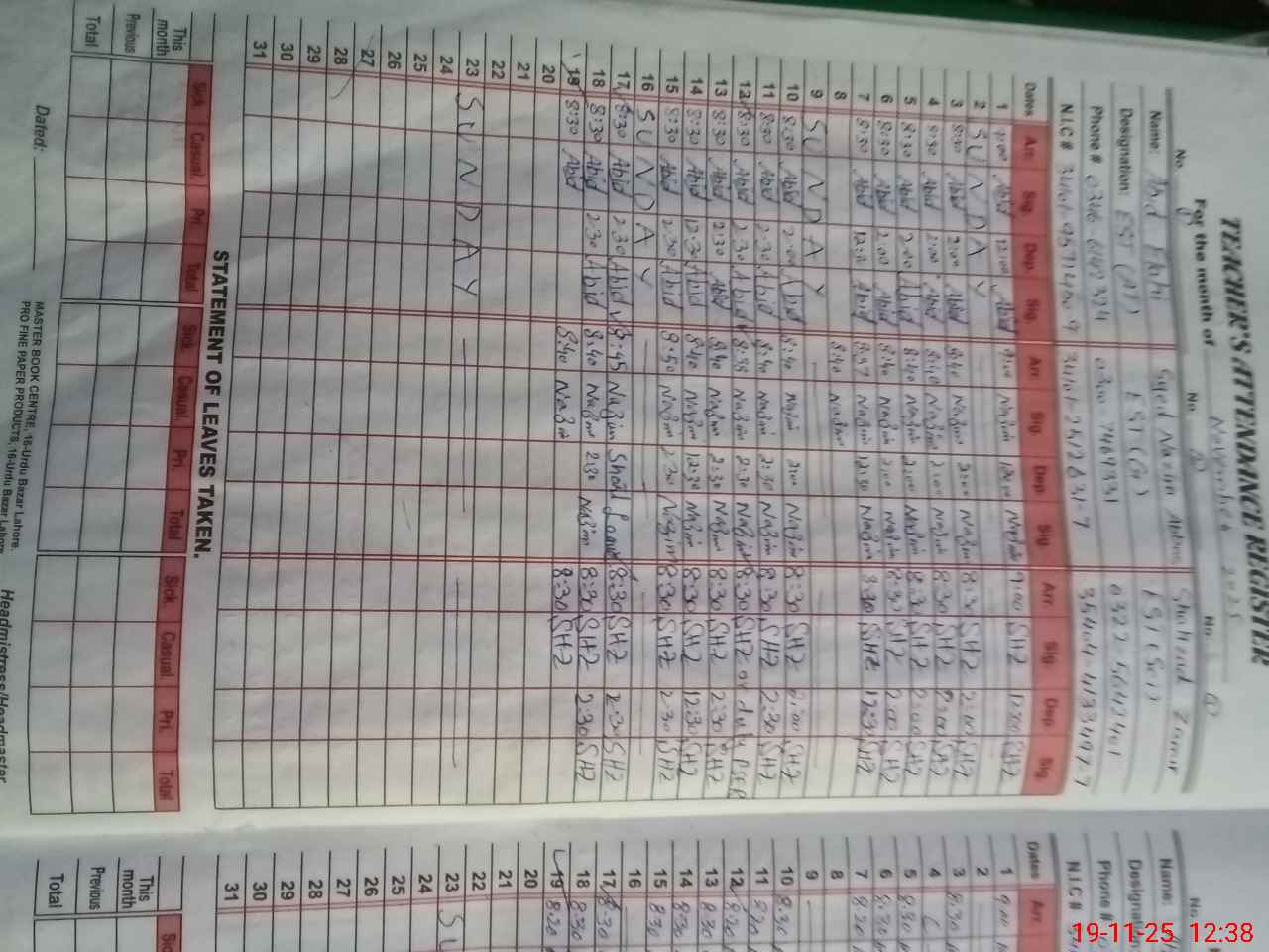 | CNIC | Full Name | Designation | R/C | Absence During Last Calender Month |