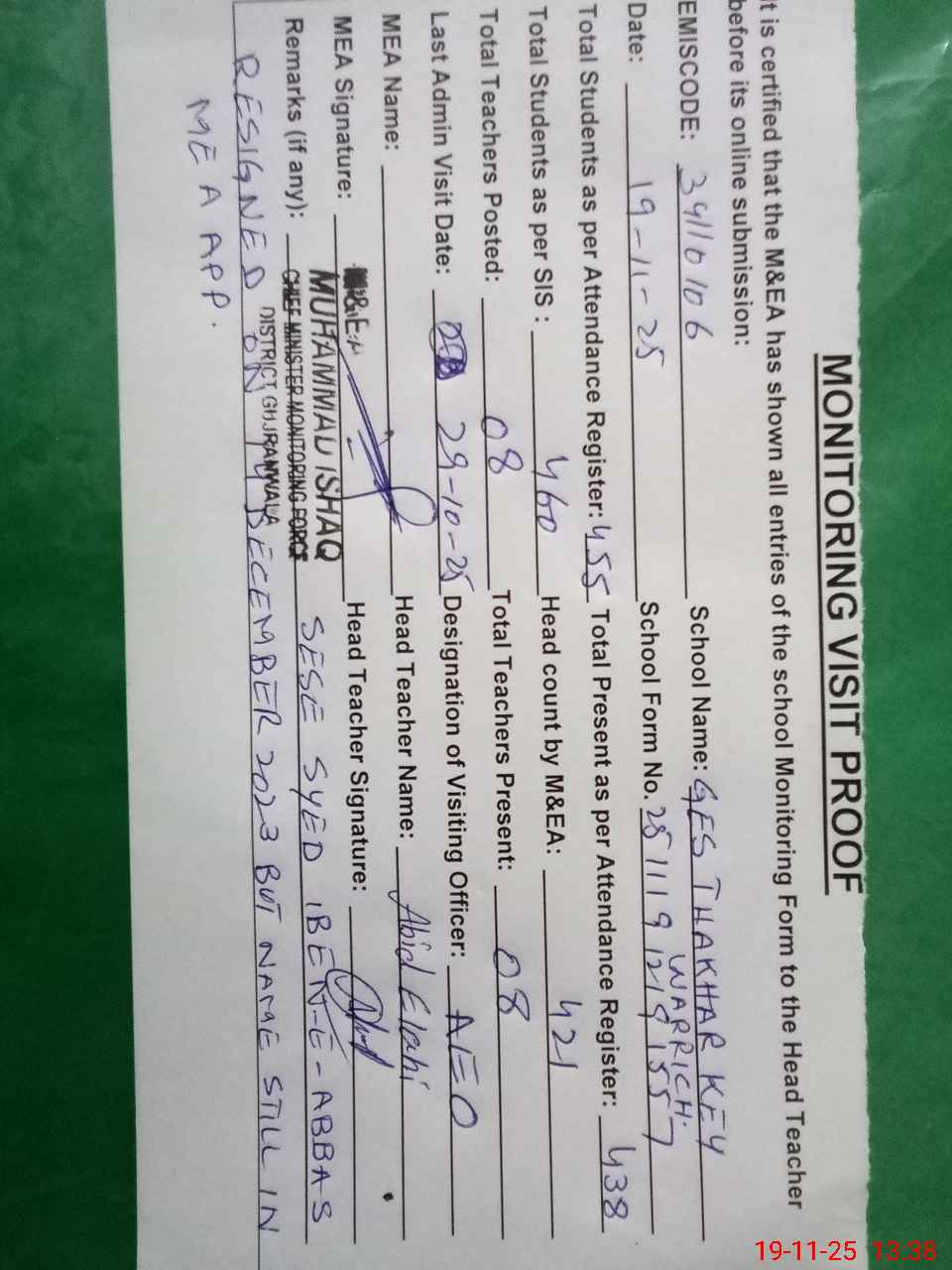 | Attendance Register | Head Teacher | MEA with School | Visit Proof |