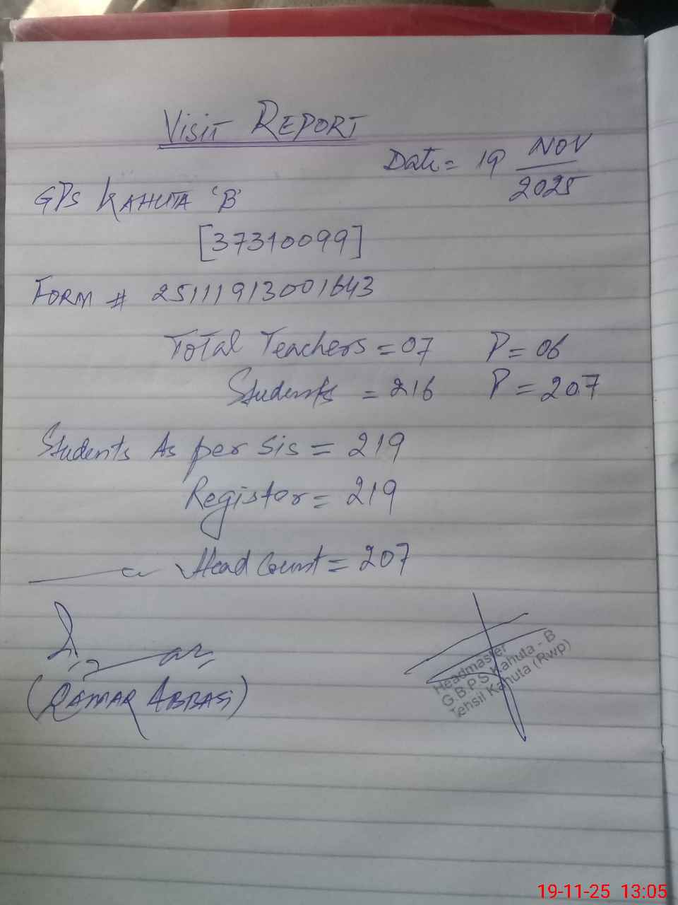 | Attendance Register | Head Teacher | MEA with School | Visit Proof |