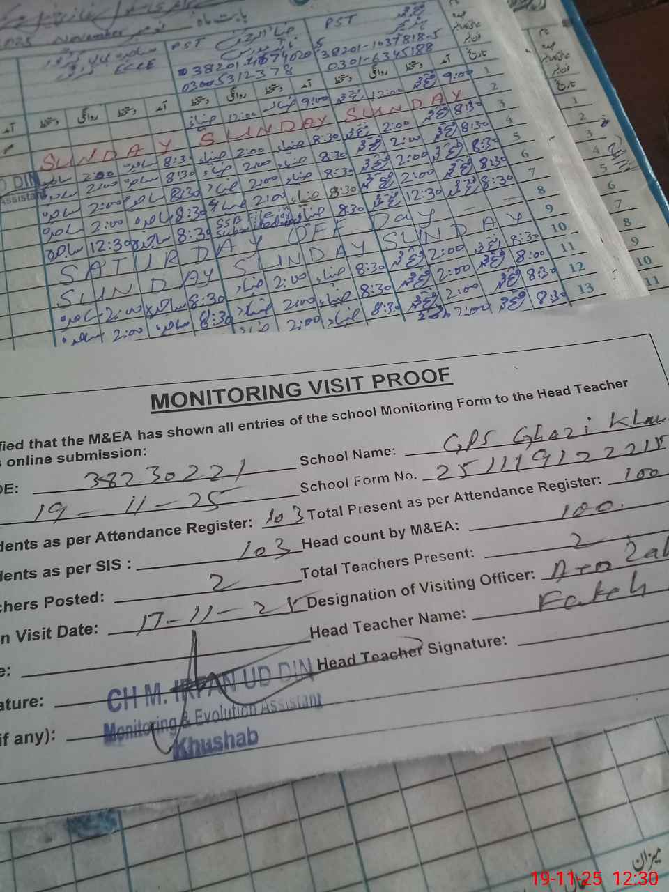 | Remarks (Use Separate Page if Required): Gps ghazi khail Student on sis 103 Student on register103 Head count 100 No teacher absent Last visit aeo zahoor 17 Nov Teaching staff required One room is dangerous | |||||