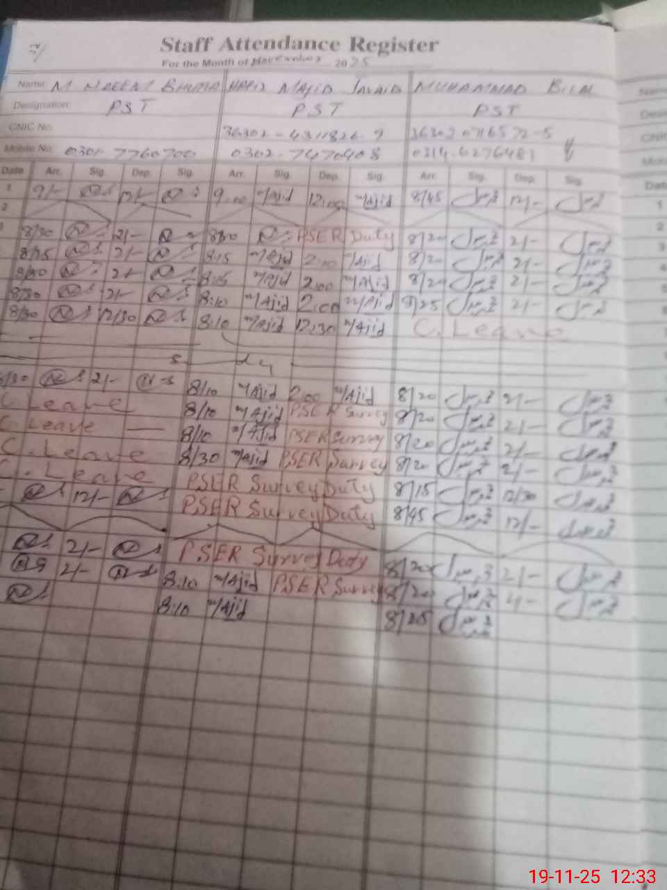 | CNIC | Full Name | Designation | R/C | Absence during last cal. month |