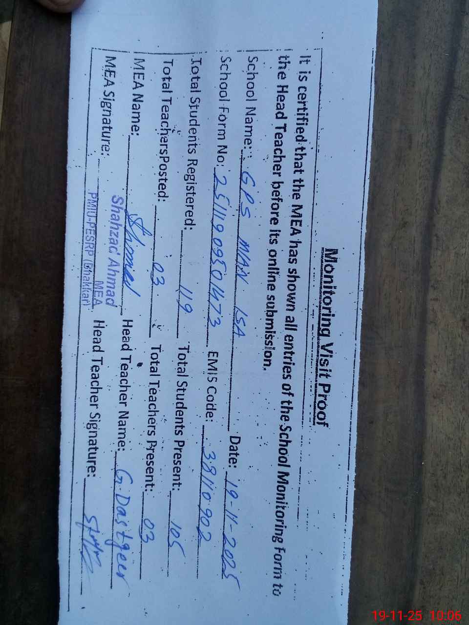 | Attendance Register | Head Teacher | MEA with School | Visit Proof |