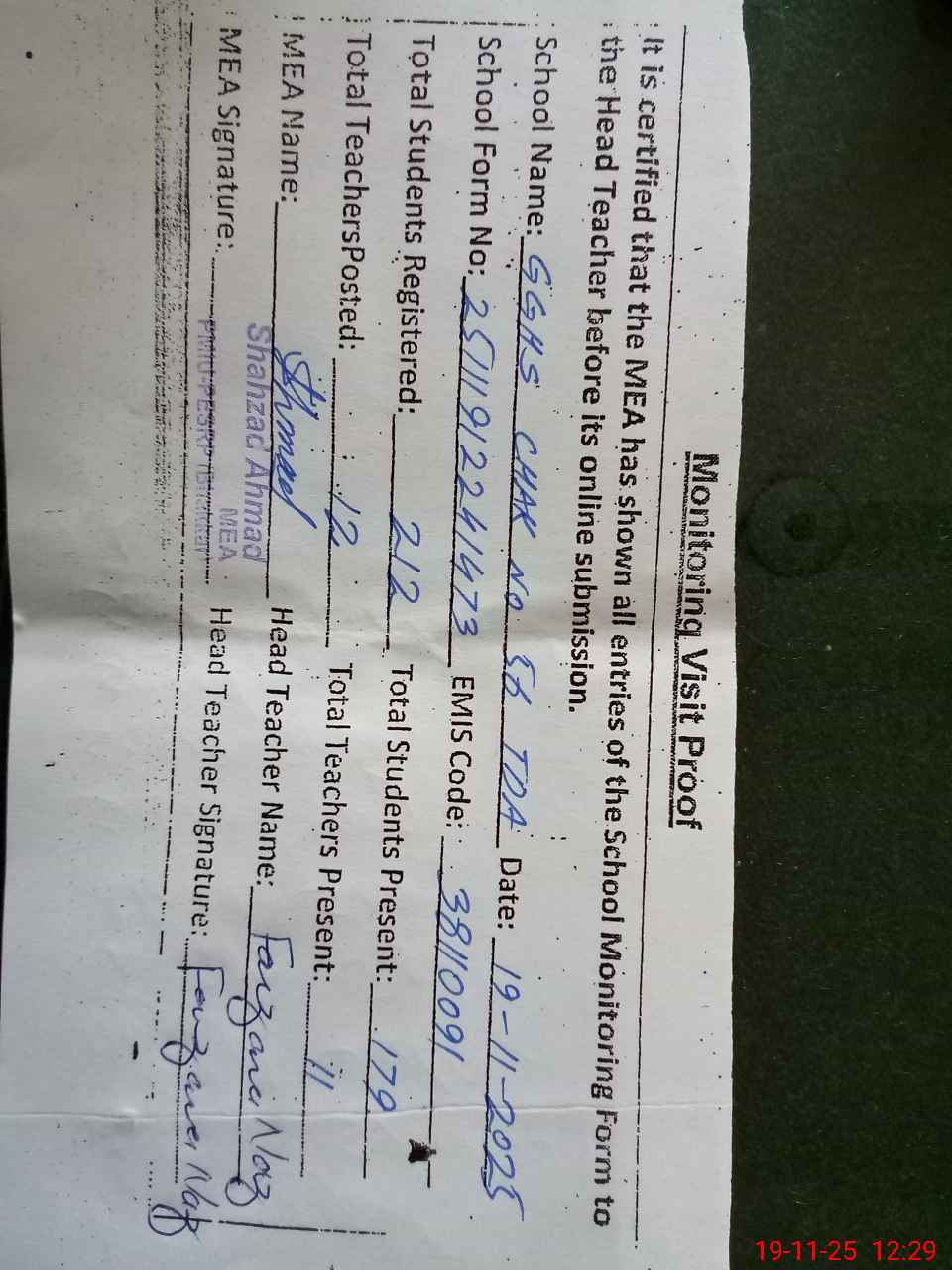 | Remarks (Use Separate Page if Required): Last visit Munir Ahmad Aulakh DEO SE 22 September 2025 | |||||