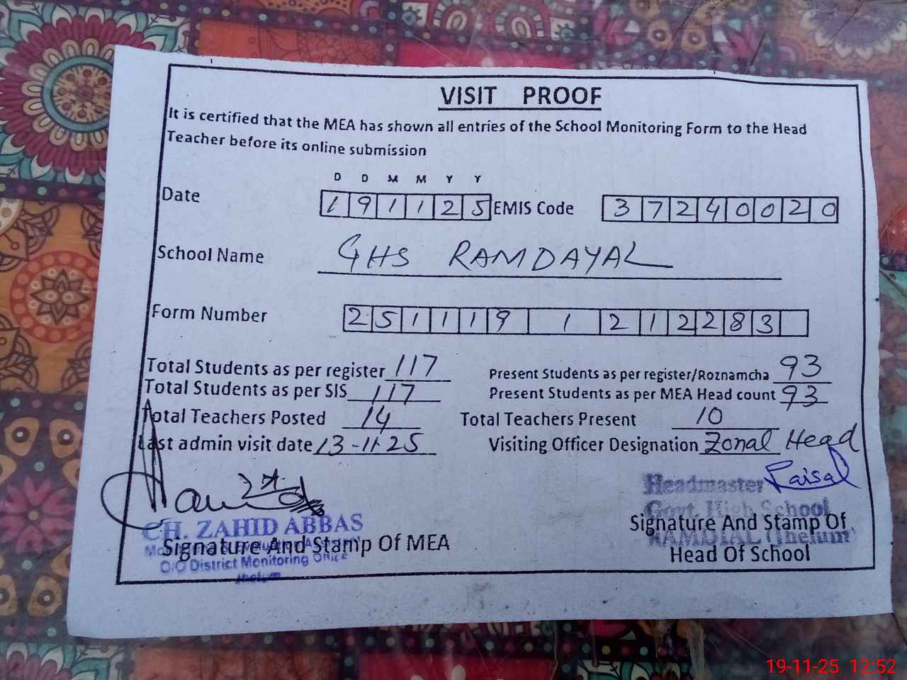 | EMIS Code: 37240020 | Name of School: GHS RAMDAYAL | |||