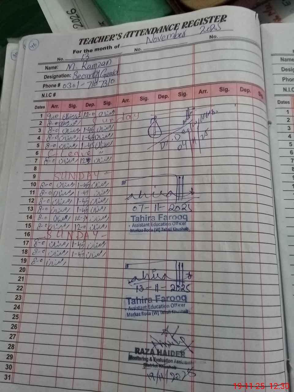 | CNIC | Full Name | Designation | R/C | Absence during last cal. month |