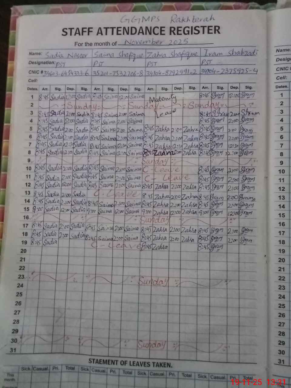 | CNIC | Full Name | Designation | R/C | Absence During Last Calender Month |
