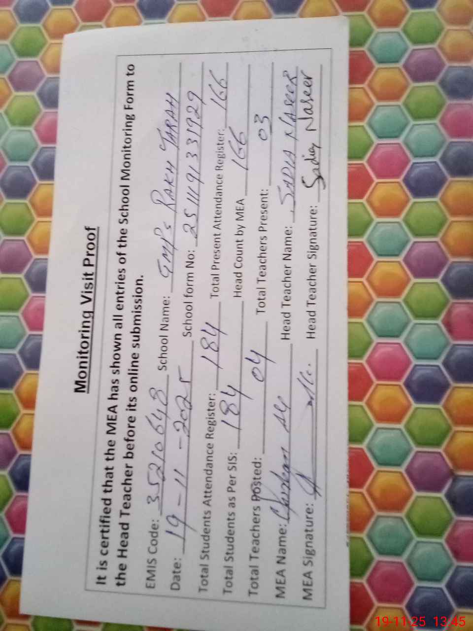 | Attendance Register | Head Teacher | MEA with School | Visit Proof |