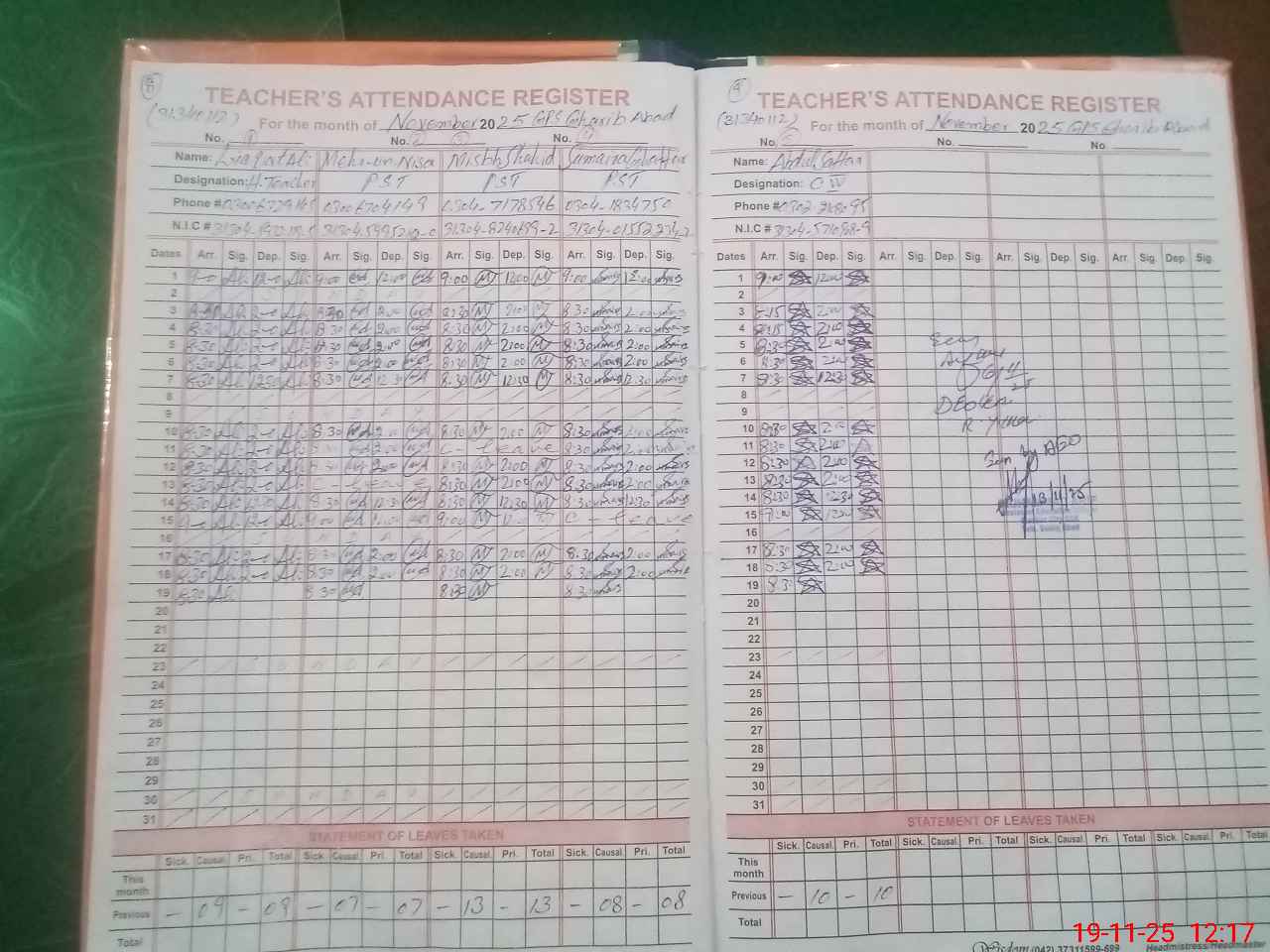 | CNIC | Full Name | Designation | R/C | Absence During Last Calender Month |