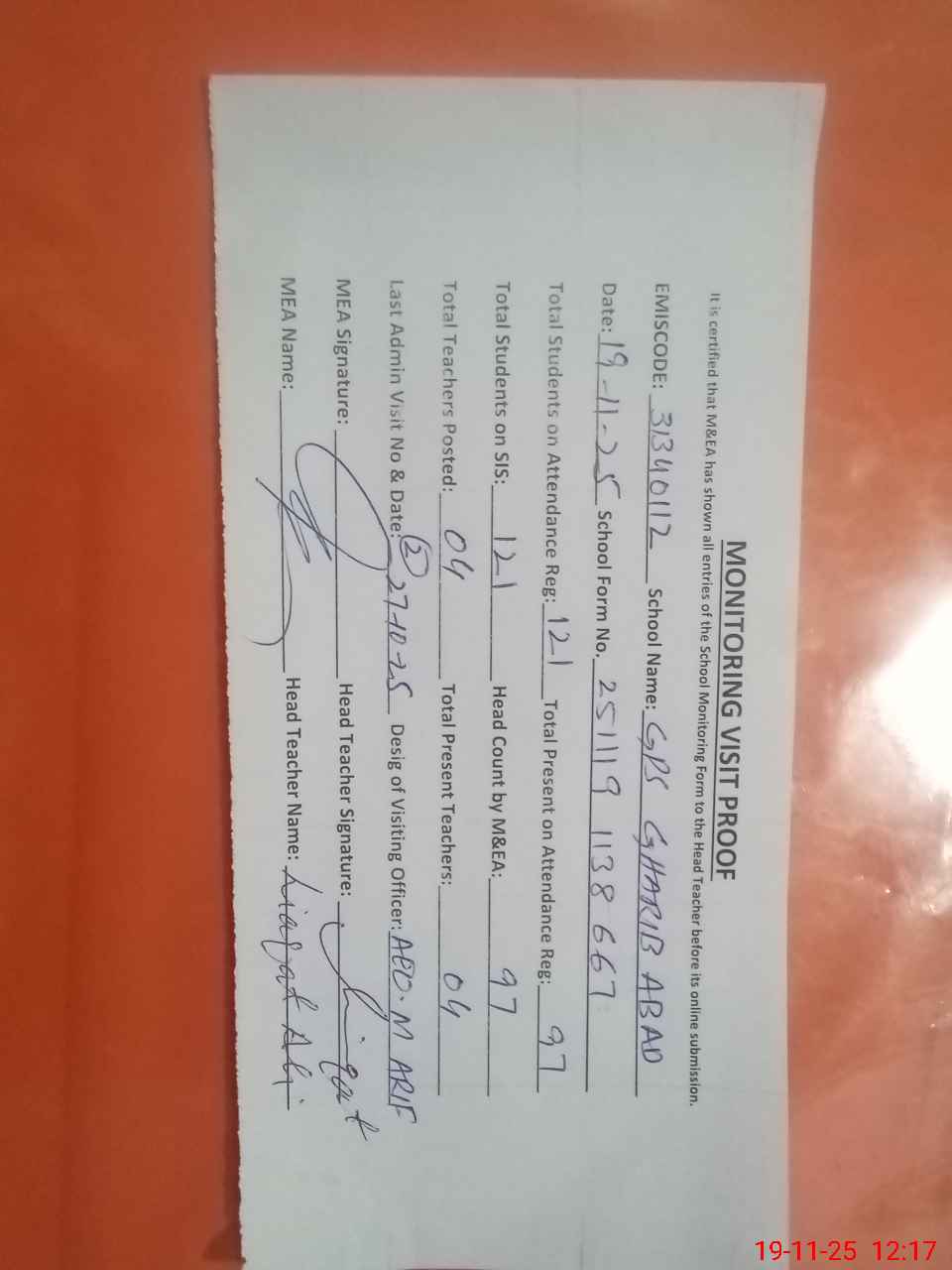 | Attendance Register | Head Teacher | MEA with School | Visit Proof |