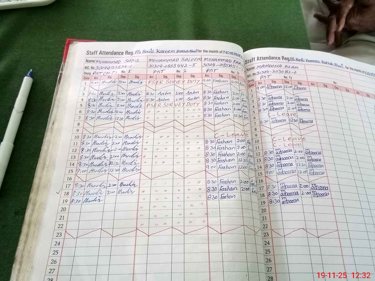 | CNIC | Full Name | Designation | R/C | Absence during last cal. month |
