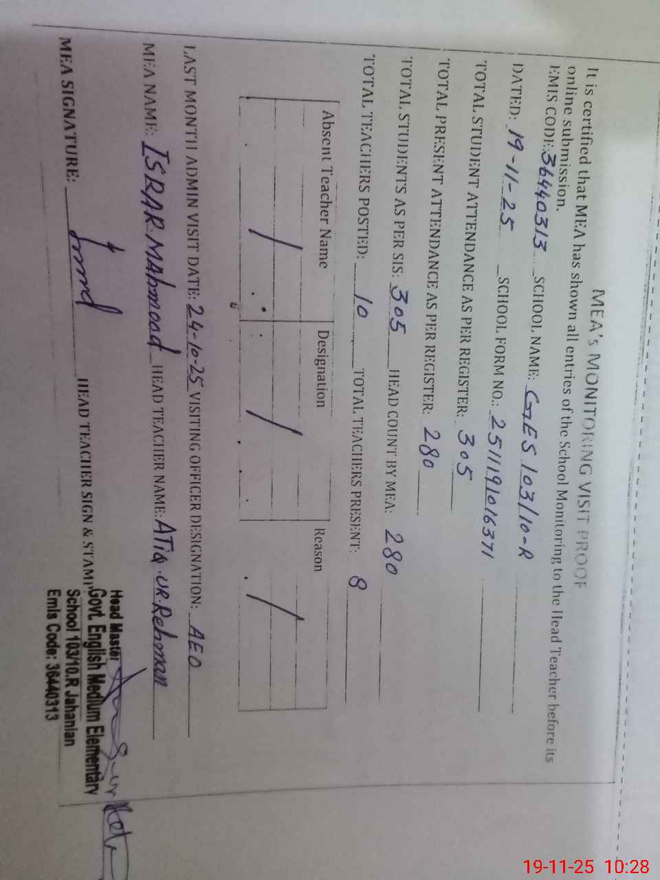 | Attendance Register | Head Teacher | MEA with School | Visit Proof |