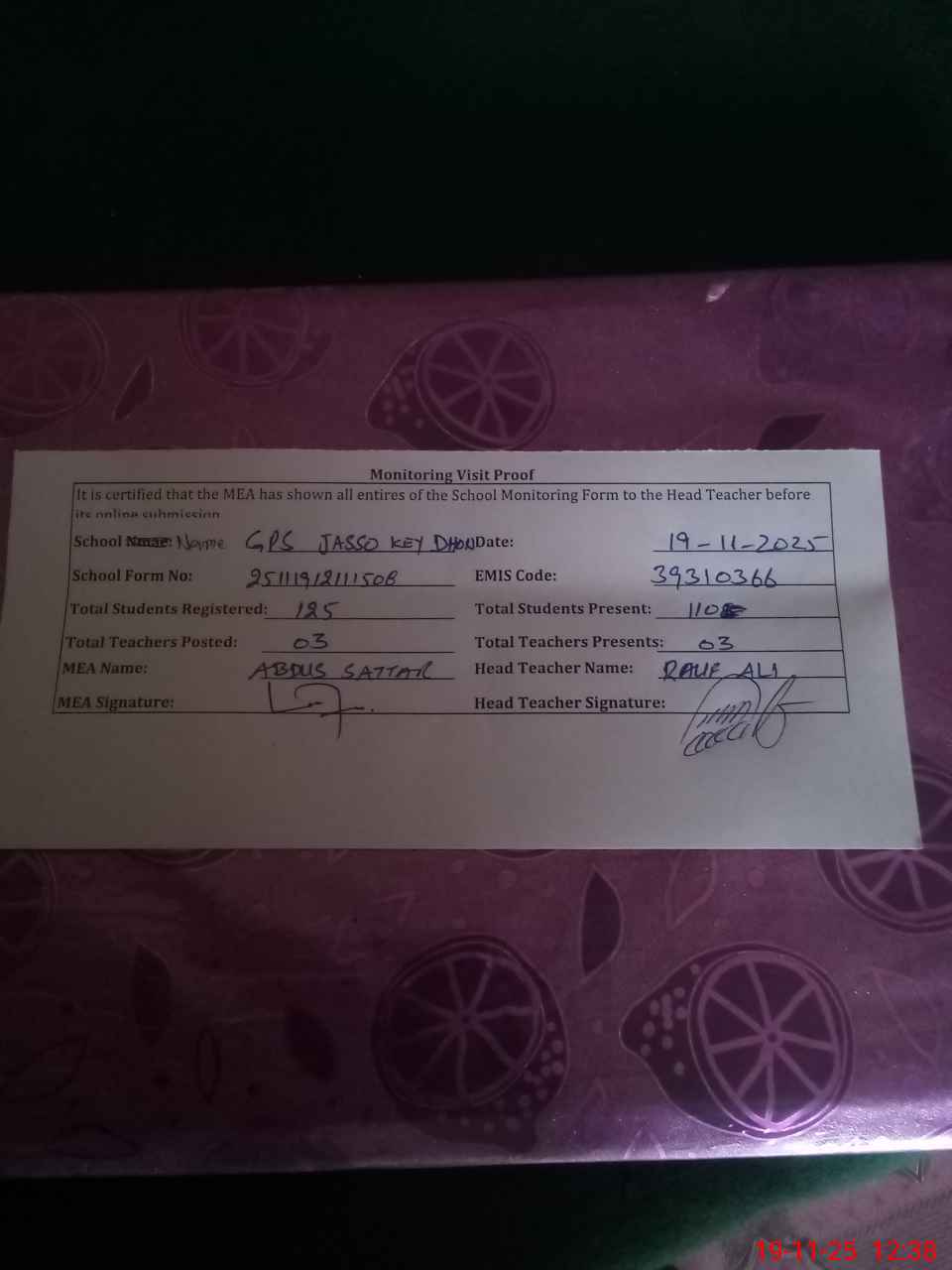 | Remarks (Use Separate Page if Required): Last administrator visit was carried out by AEO on 3 November 2025 | |||||