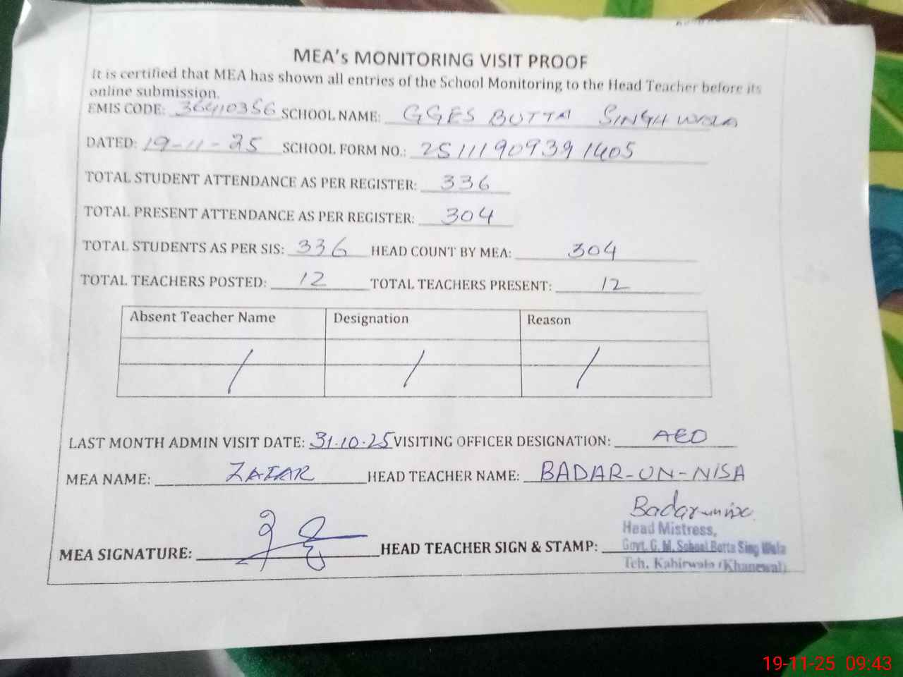 | EMIS Code: 36410356 | Name of School: GGES BUTTA SINGH WALA, KABIRWALA | |||