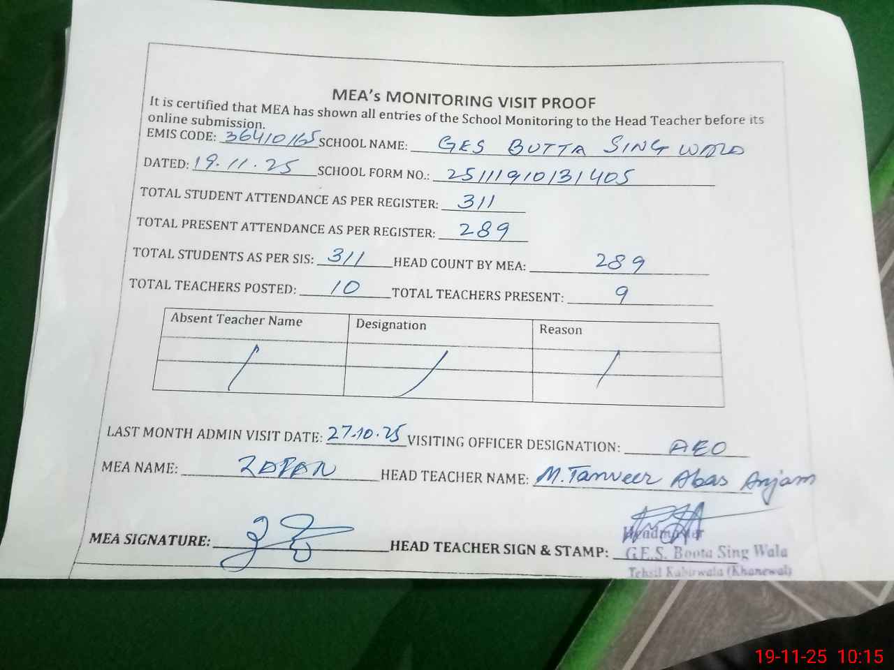| EMIS Code: 36410165 | Name of School: GES BUTTA SINGH WALA, P/O MOUZA BUTTA SINGH WALA, KABIRWALA | |||