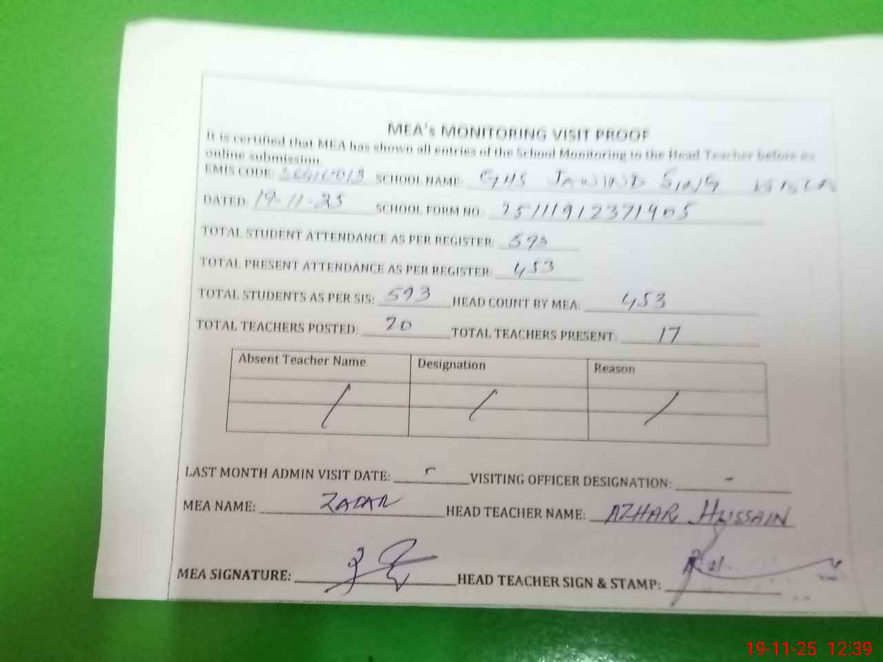 | Attendance Register | Head Teacher | MEA with School | Visit Proof |