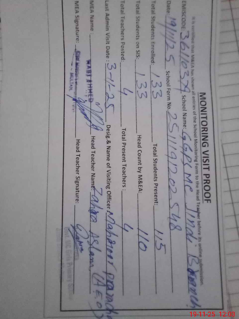 | Attendance Register | Head Teacher | MEA with School | Visit Proof |