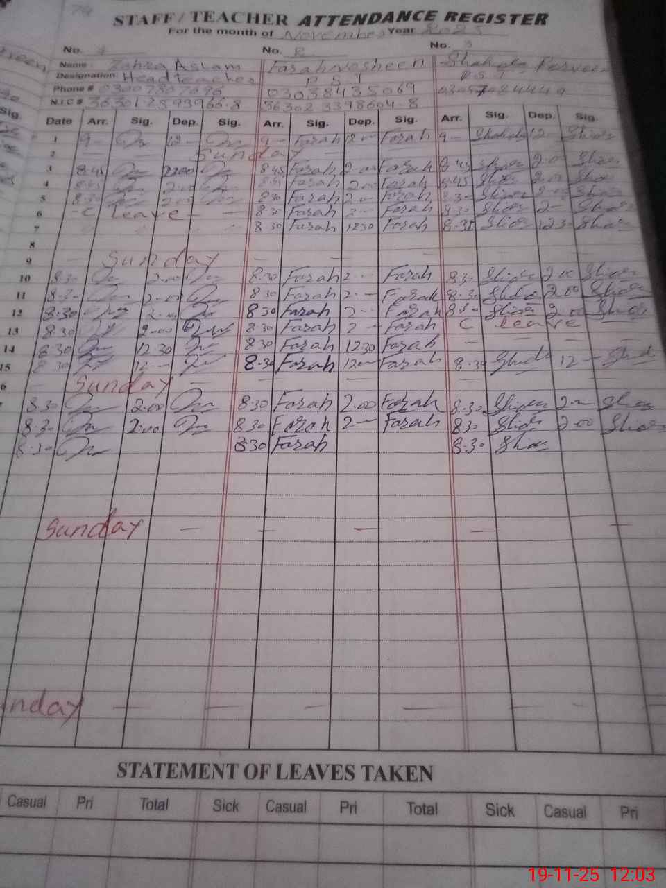 | CNIC | Full Name | Designation | R/C | Absence During Last Calender Month |