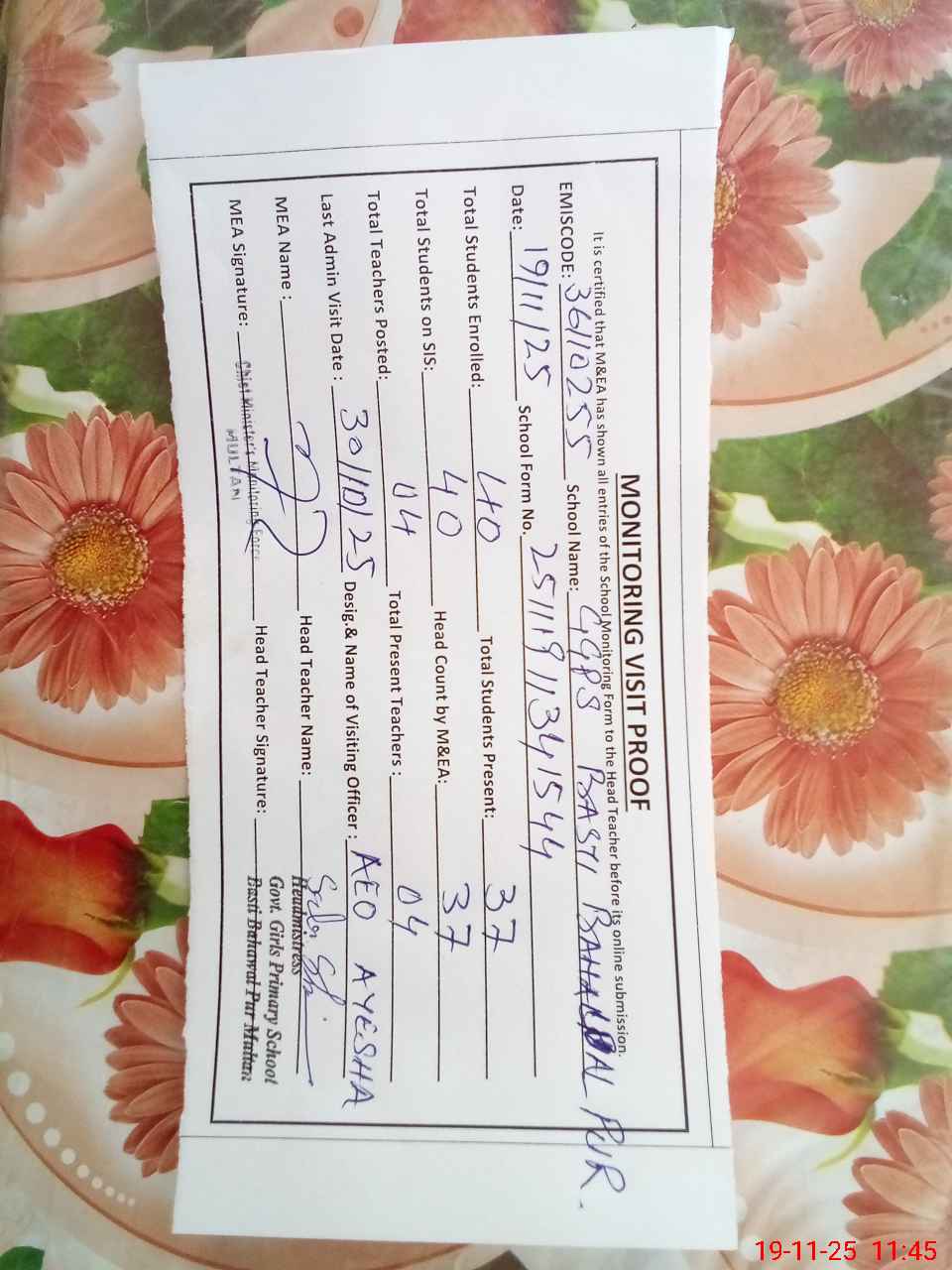 | Certified that this School was Inspected by the Undersigned MEA/DMO Today and the Information Stated Above is as Per Record. | |||||