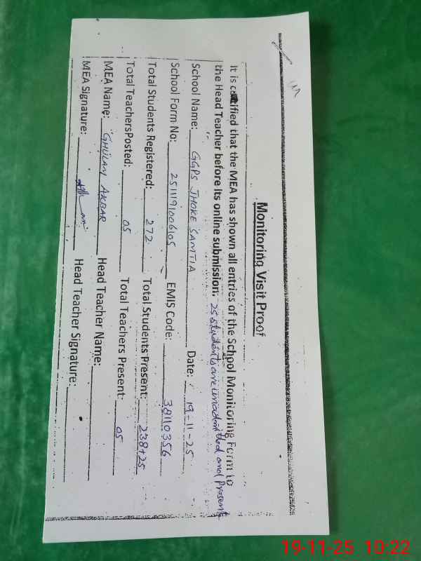 | Attendance Register | Head Teacher | MEA with School | Visit Proof |