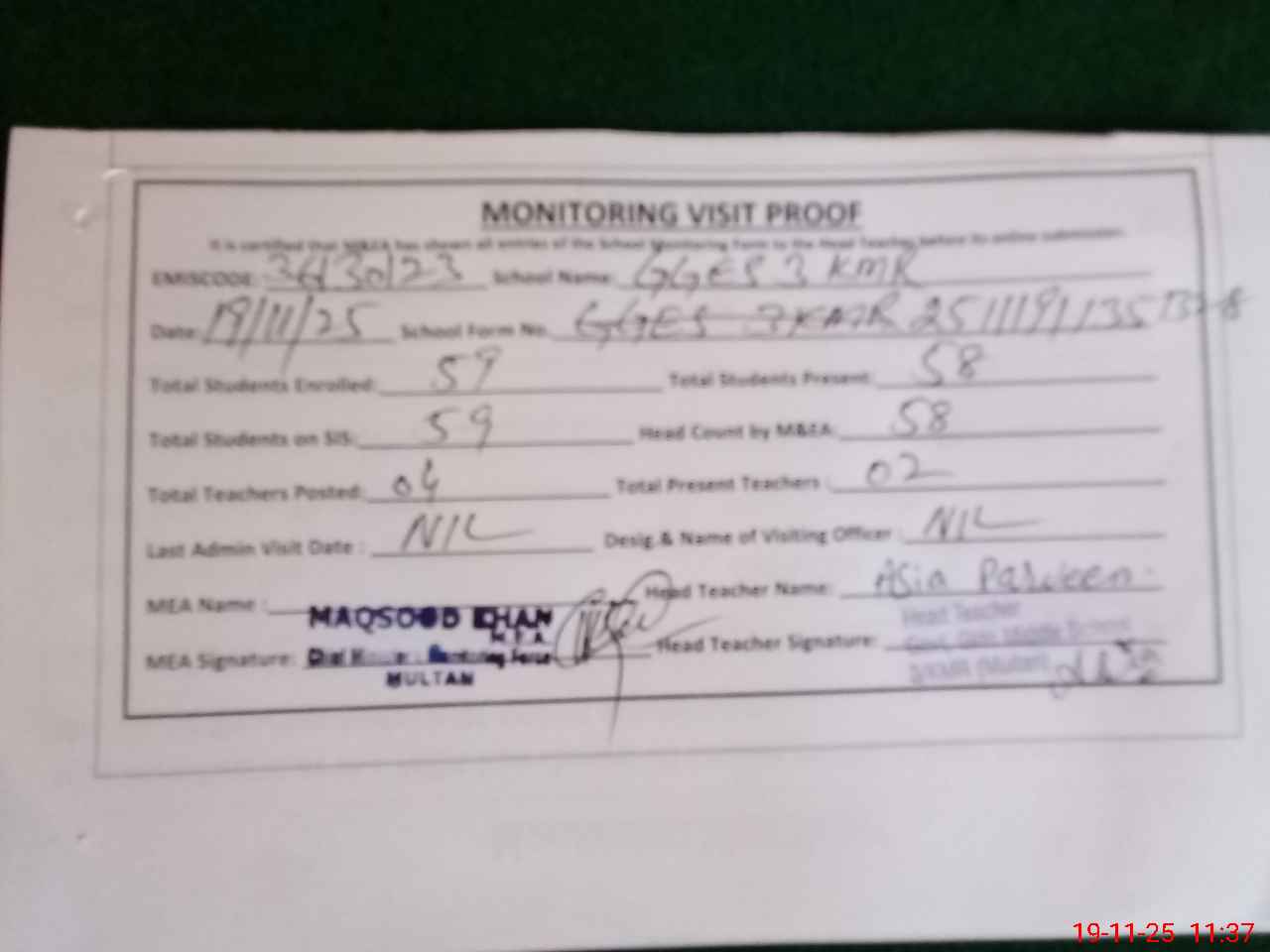 | Attendance Register | Head Teacher | MEA with School | Visit Proof |