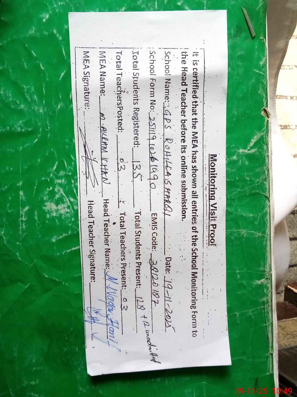 | Attendance Register | Head Teacher | MEA with School | Visit Proof |