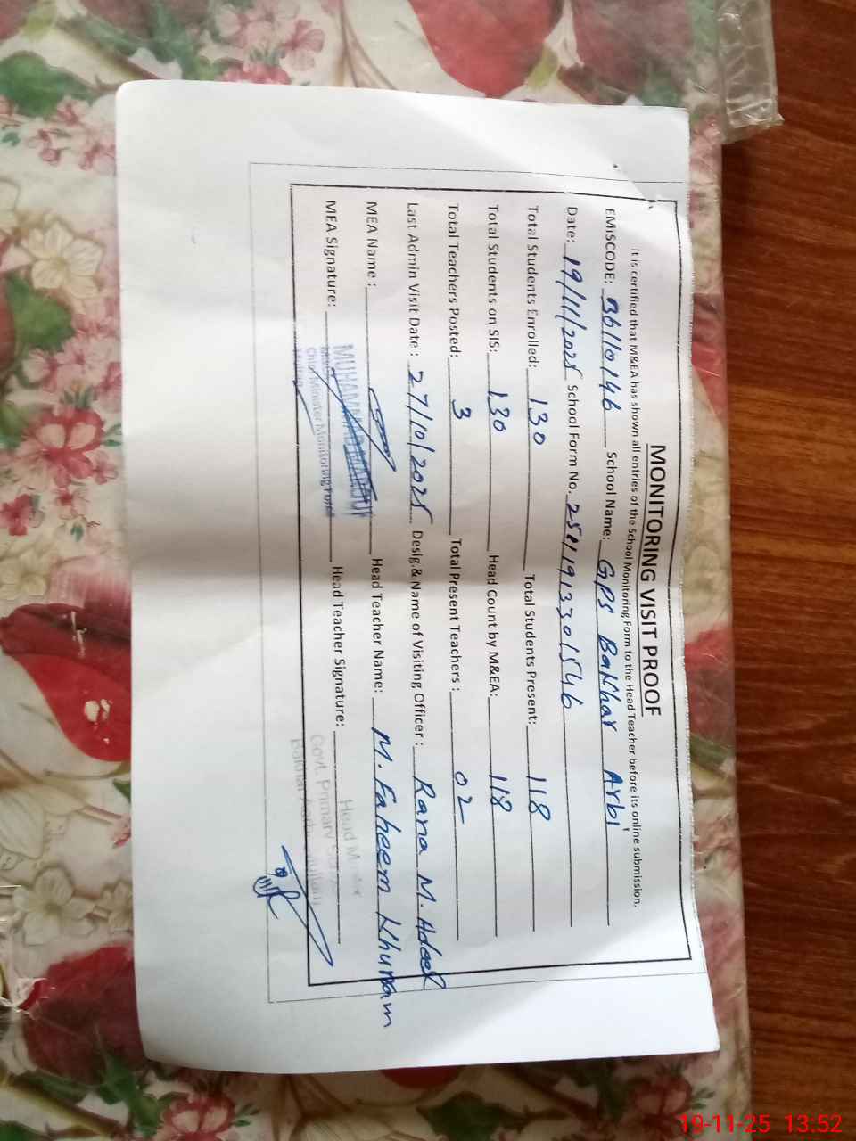 | Certified that this School was Inspected by the Undersigned MEA/DMO Today and the Information Stated Above is as Per Record. | |||||
