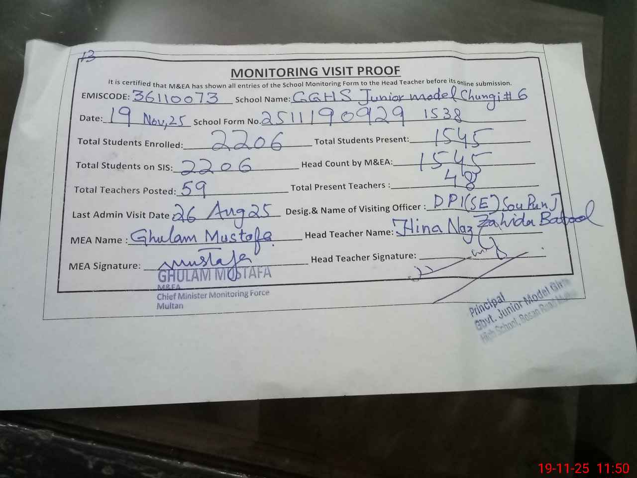 | EMIS Code: 36110073 | Name of School: GGHS JUNIOR MODEL CHUNGI NO. 6 BOSAN ROAD MULTAN | |||