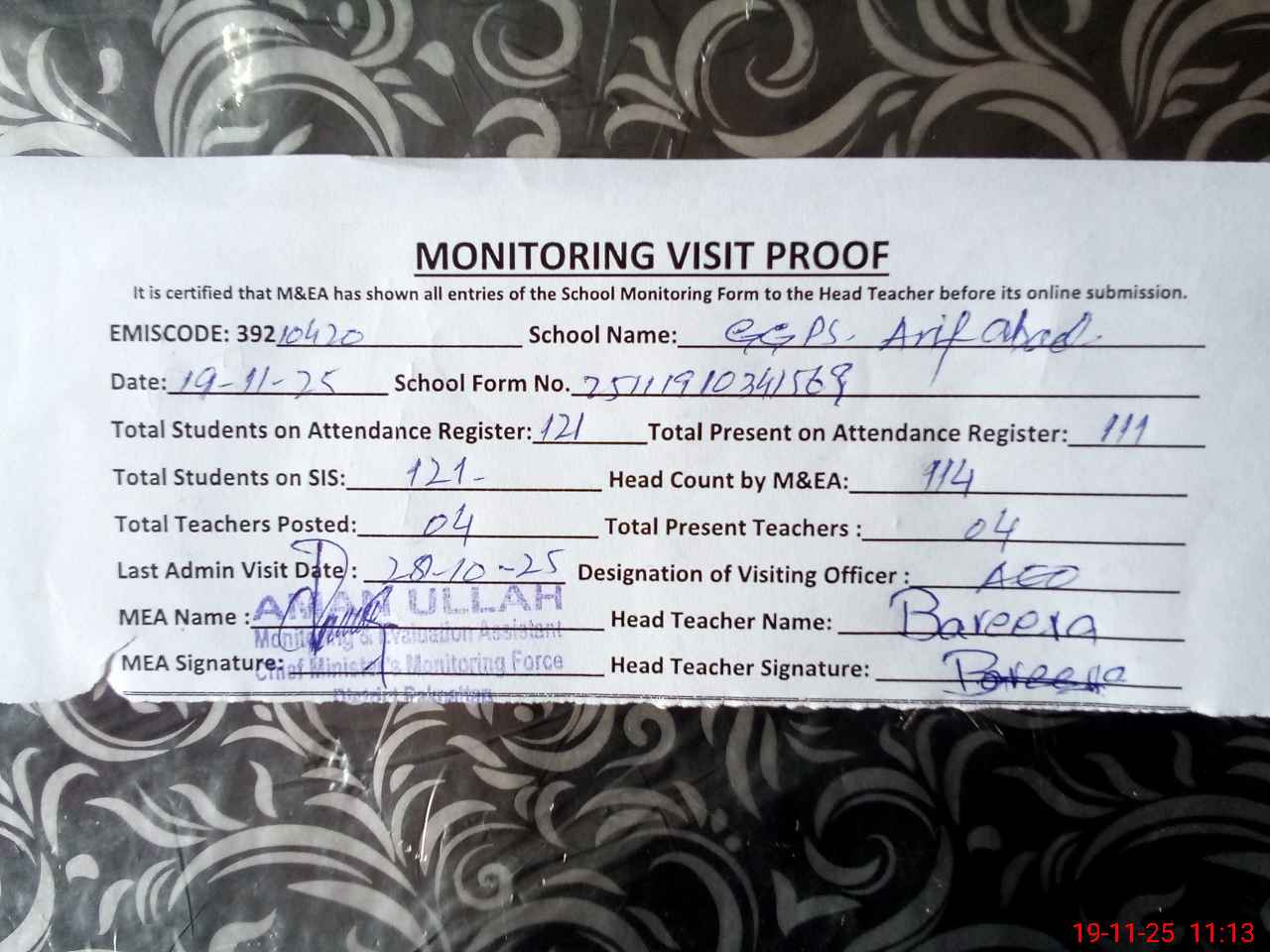 | Attendance Register | Head Teacher | MEA with School | Visit Proof |