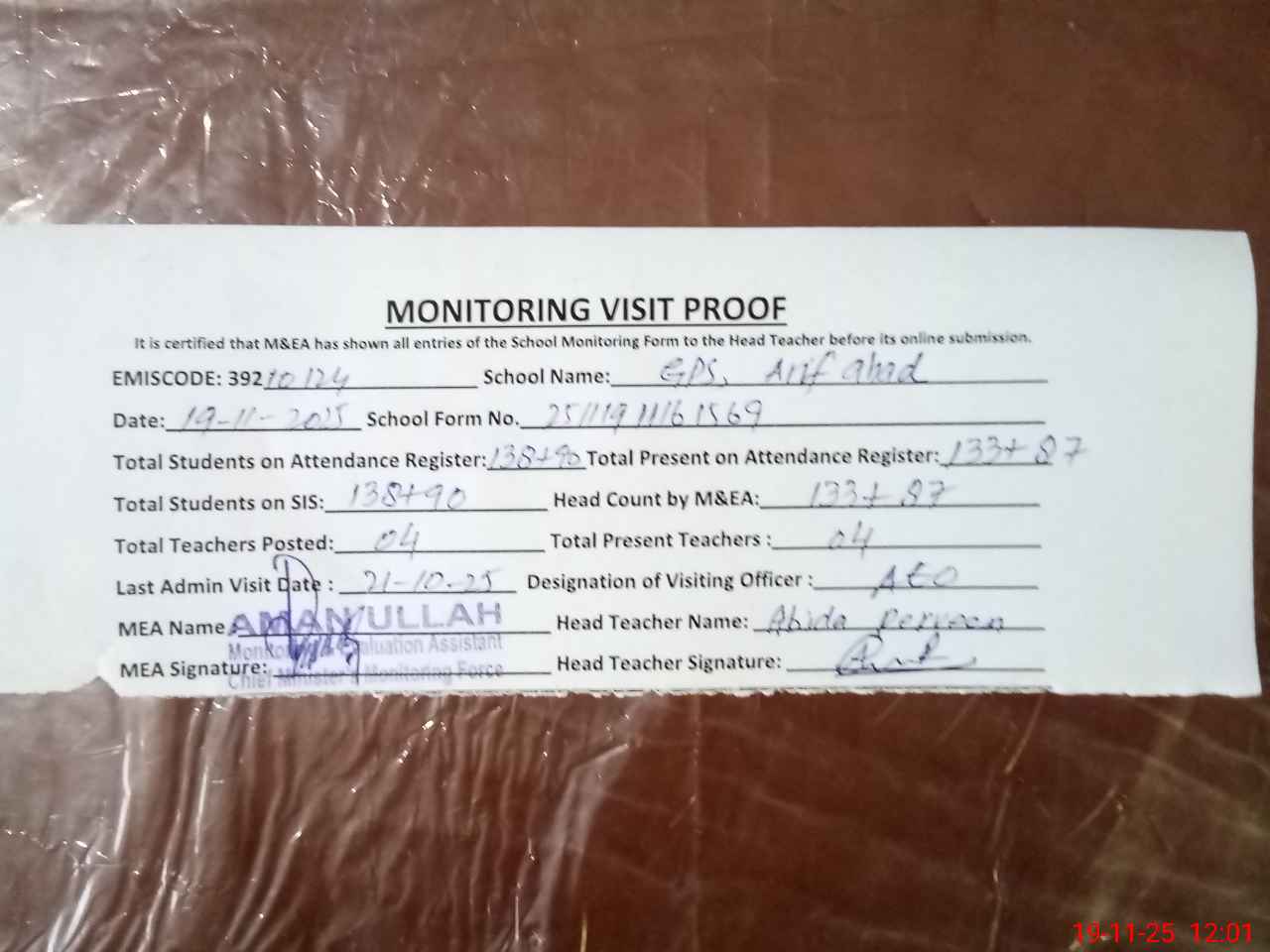 | Attendance Register | Head Teacher | MEA with School | Visit Proof |