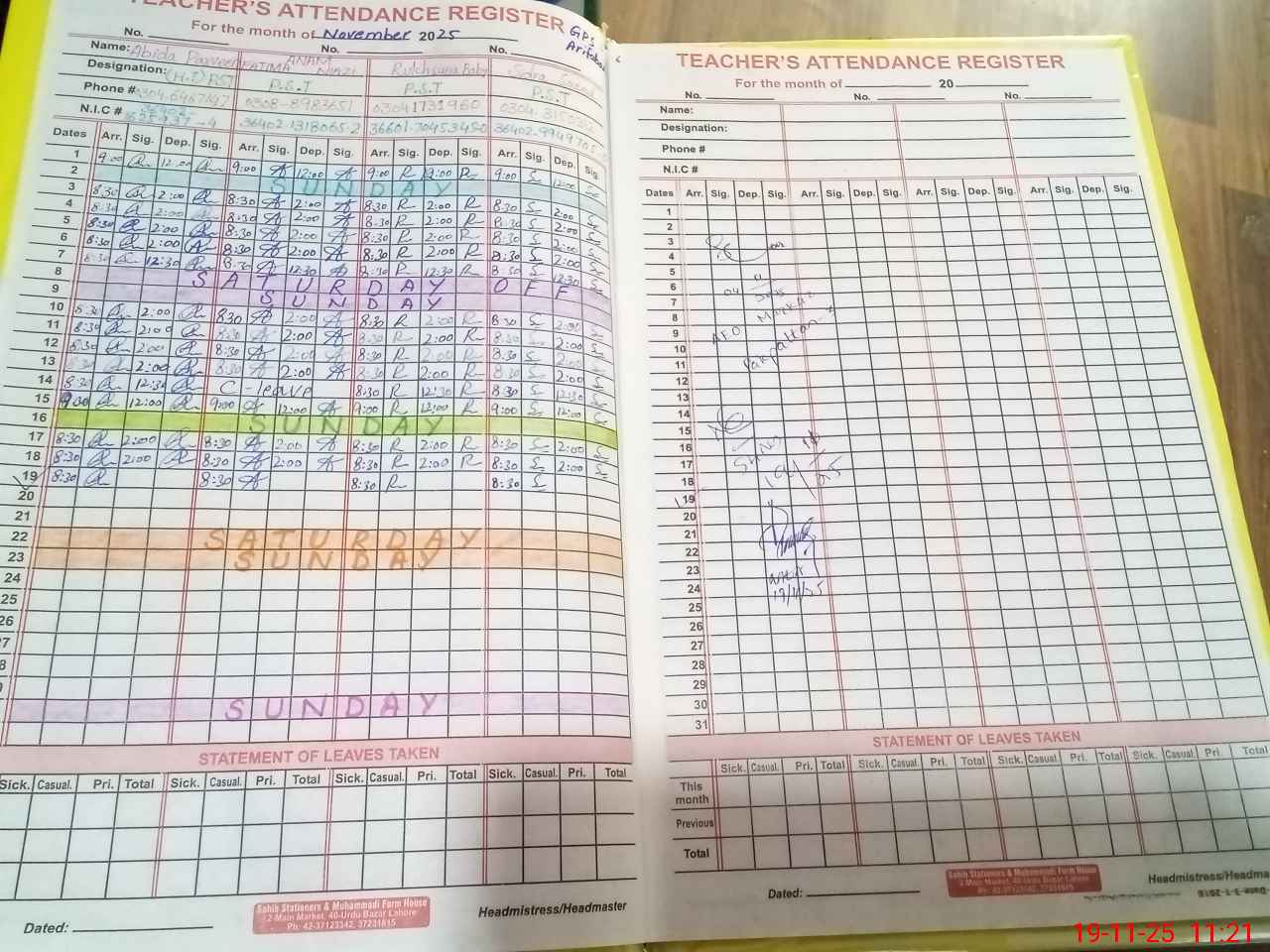 | CNIC | Full Name | Designation | R/C | Absence During Last Calender Month |
