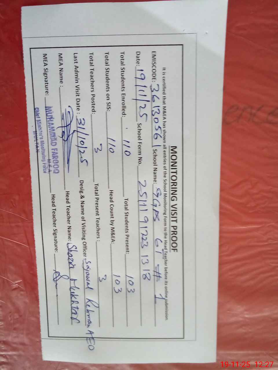 | Attendance Register | Head Teacher | MEA with School | Visit Proof |