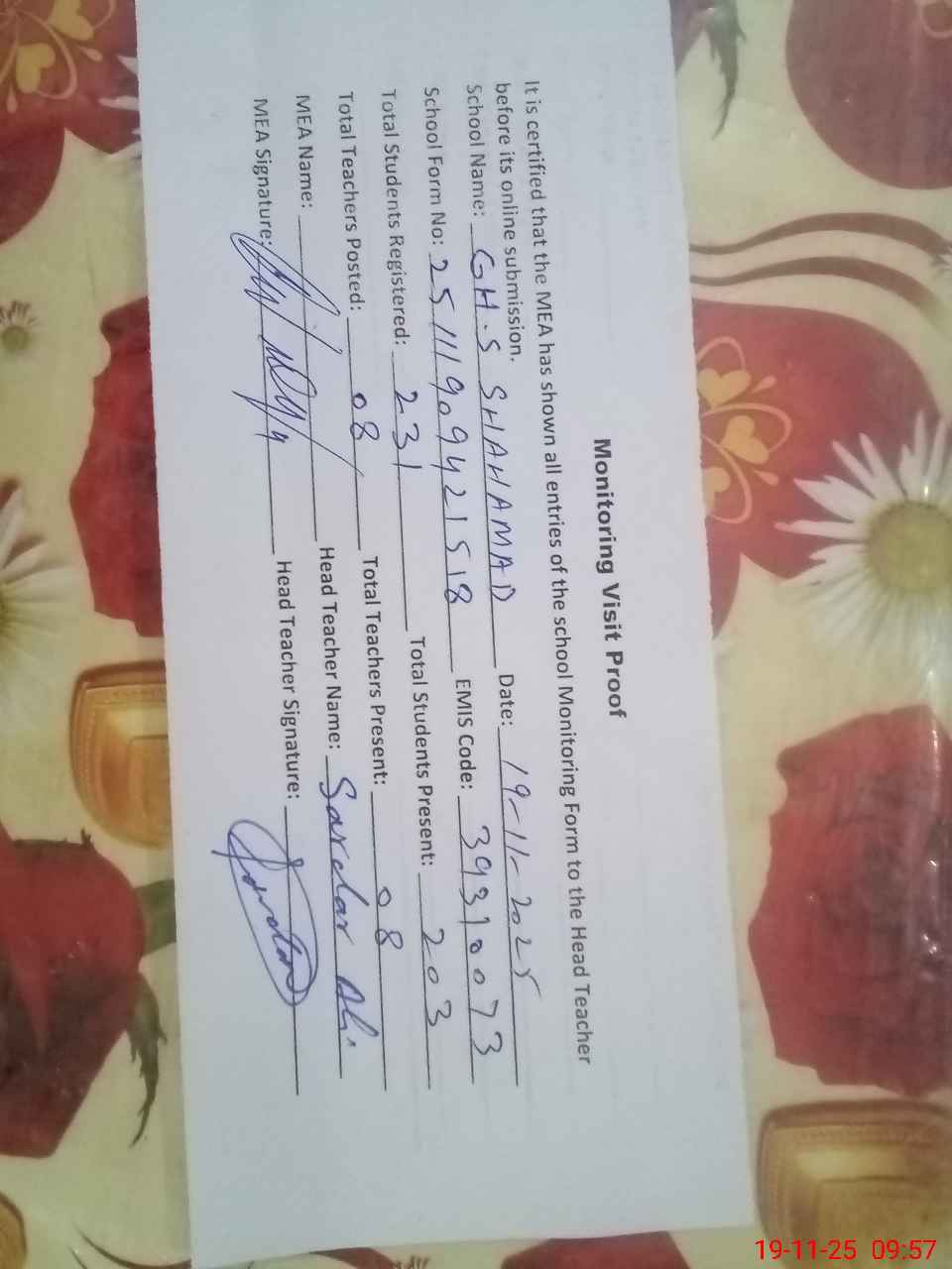 | Attendance Register | Head Teacher | MEA with School | Visit Proof |