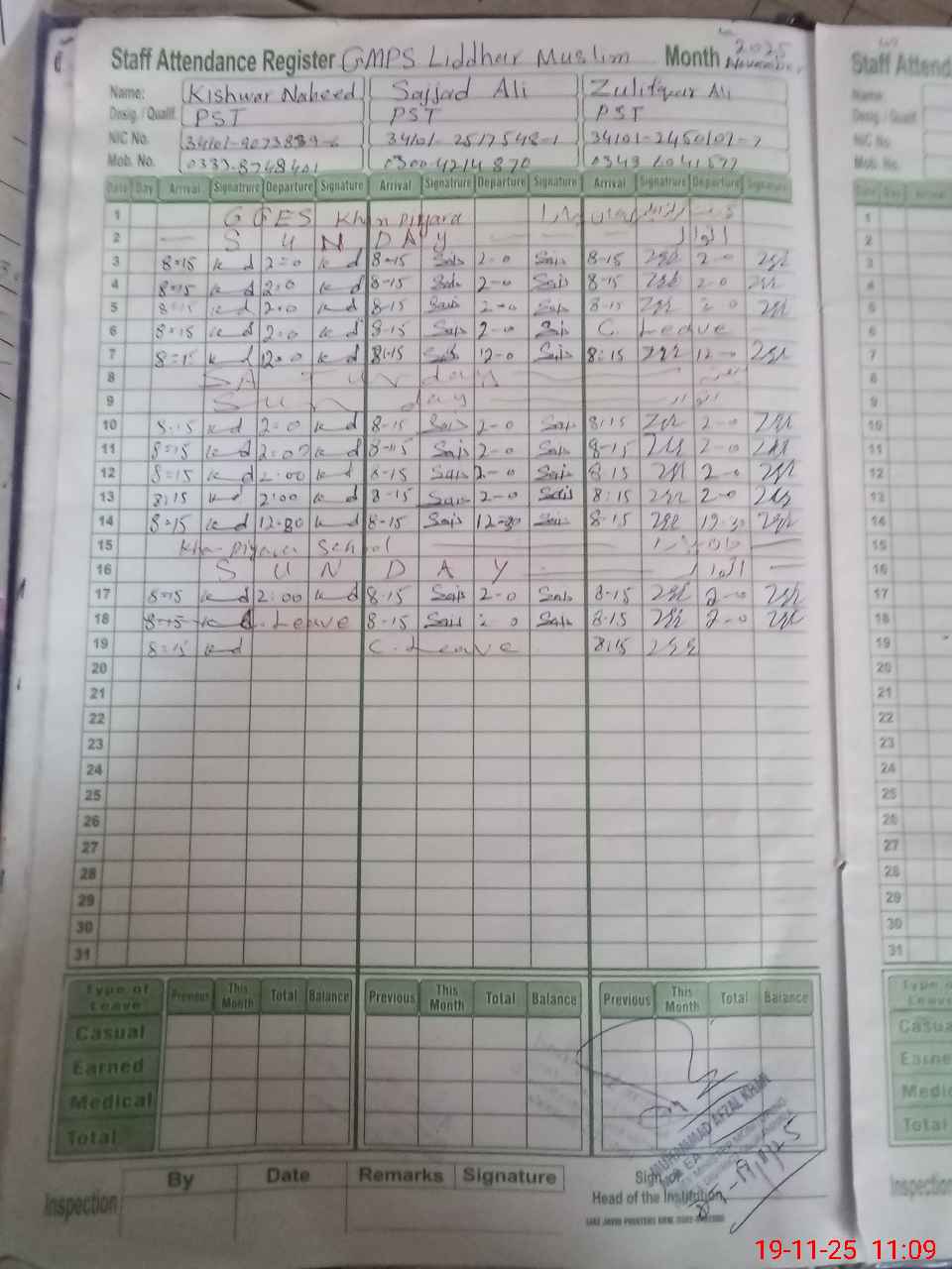 | Remarks (Use Separate Page if Required): NSB record not maintain Sir PST Teacher Sajjad Ali absent with out sanctioned leave | |||||
