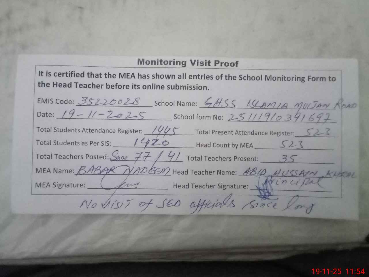 | EMIS Code: 35220028 | Name of School: GHSS ISLAMIA MULTAN ROAD | |||