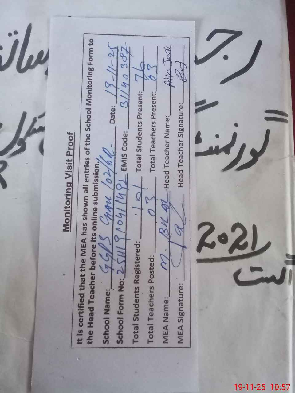 | Attendance Register | Head Teacher | MEA with School | Visit Proof |