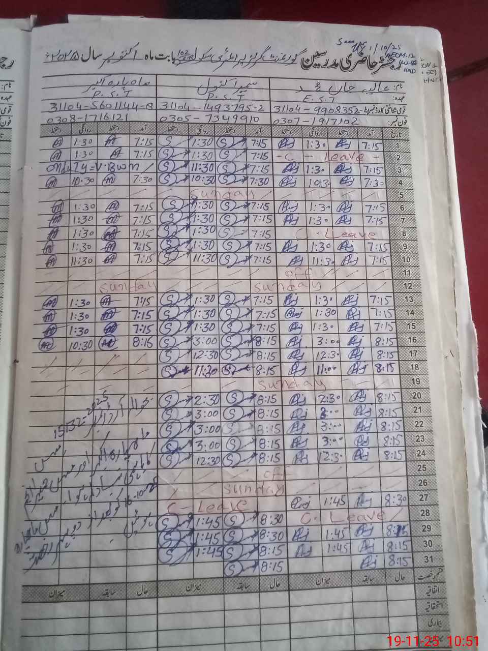 | CNIC | Full Name | Designation | R/C | Absence during last cal. month |