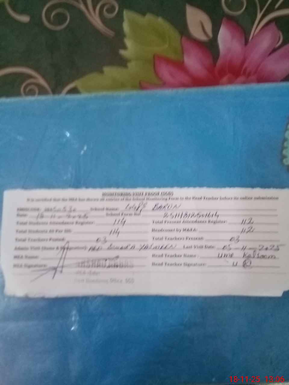| Attendance Register | Head Teacher | MEA with School | Visit Proof |