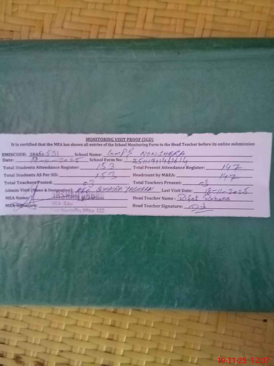 | Attendance Register | Head Teacher | MEA with School | Visit Proof |