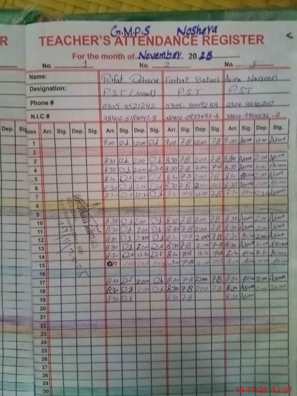 | CNIC | Full Name | Designation | R/C | Absence During Last Calender Month |
