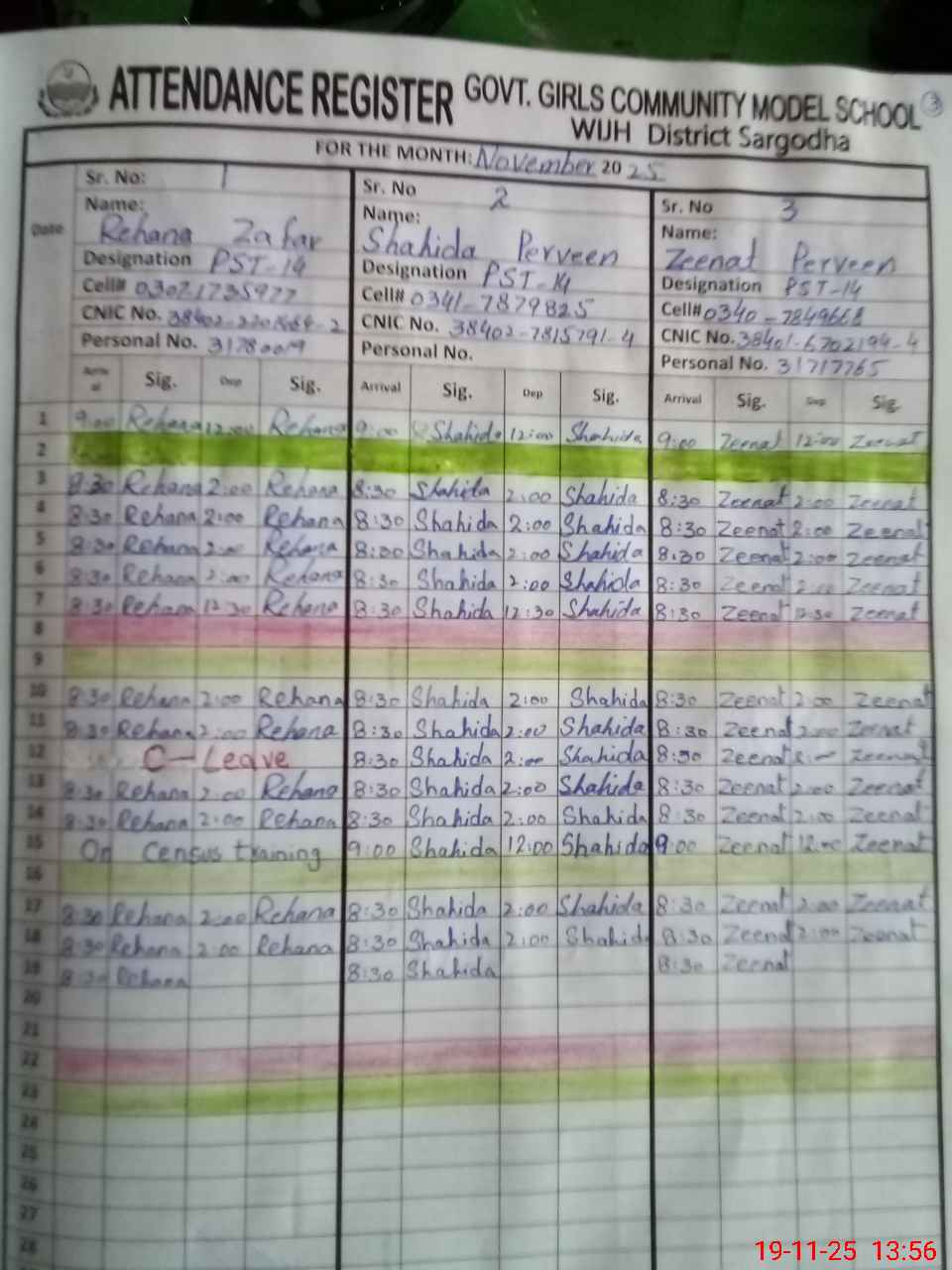 | CNIC | Full Name | Designation | R/C | Absence during last cal. month |