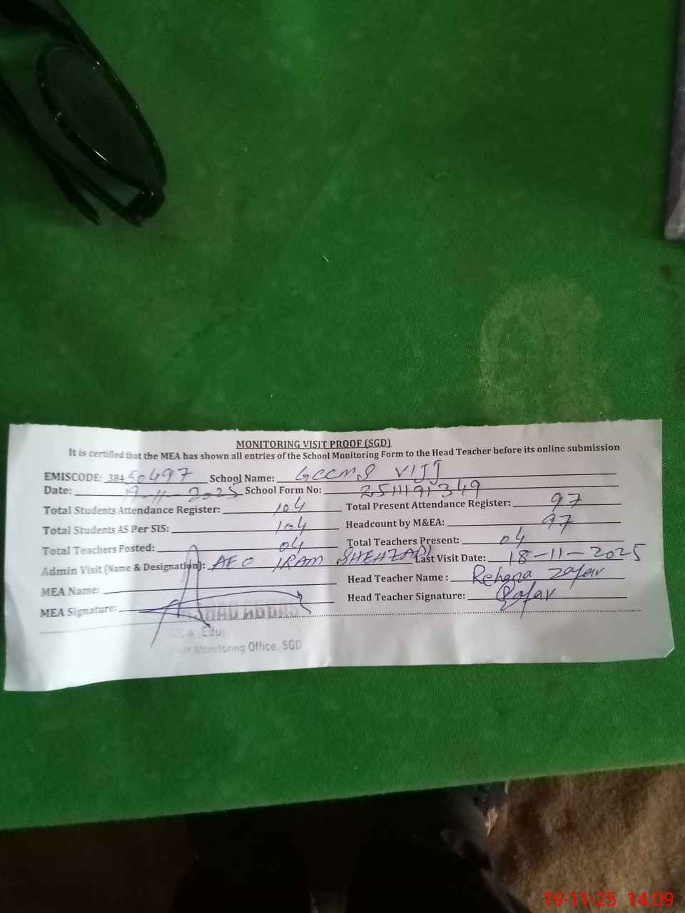 | Attendance Register | Head Teacher | MEA with School | Visit Proof |