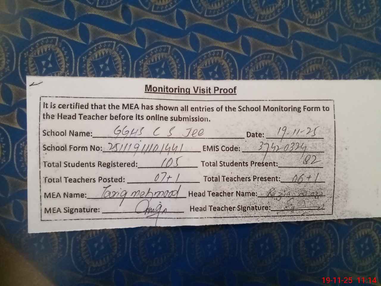 | Attendance Register | Head Teacher | MEA with School | Visit Proof |