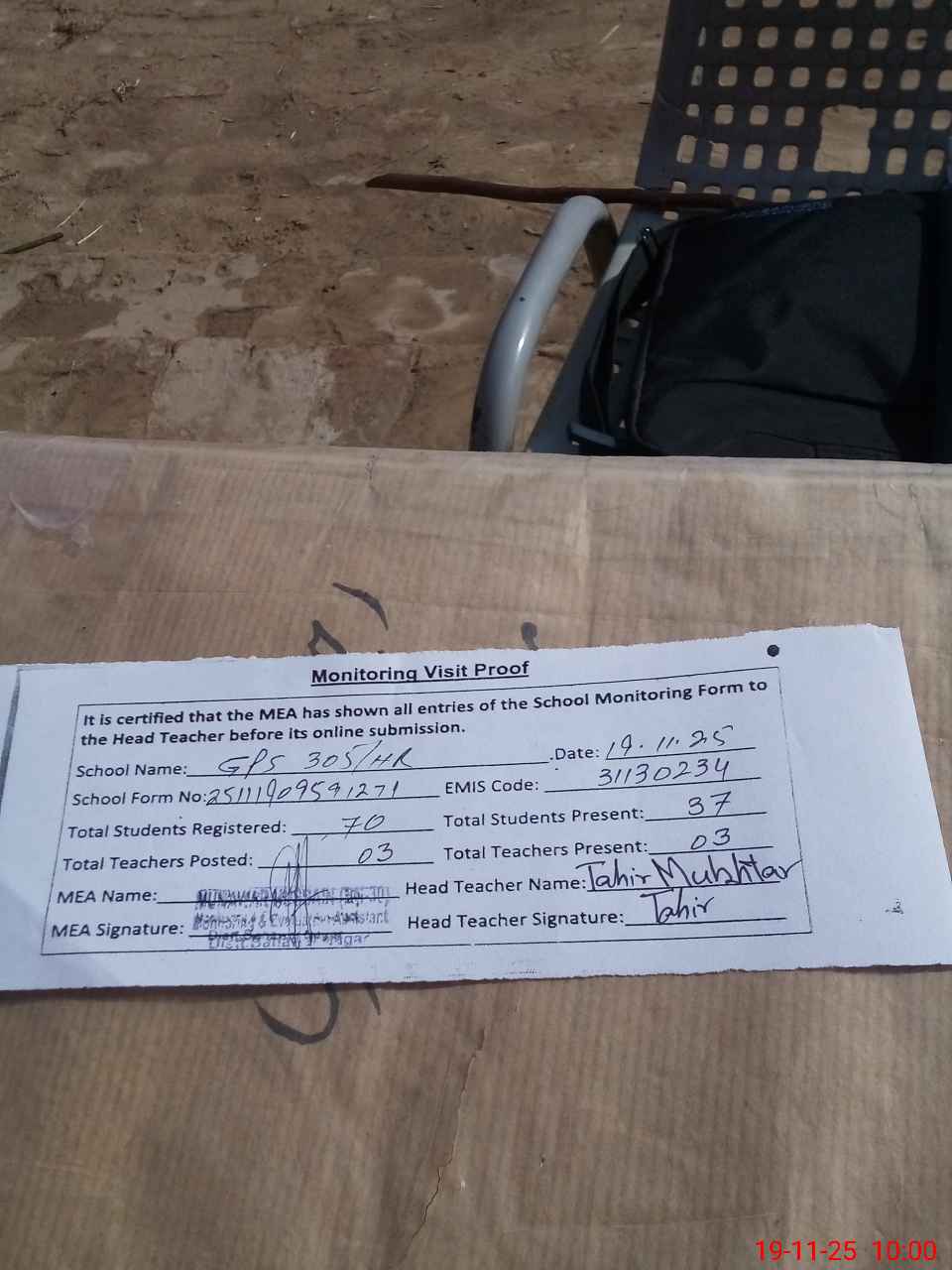 | Attendance Register | Head Teacher | MEA with School | Visit Proof |