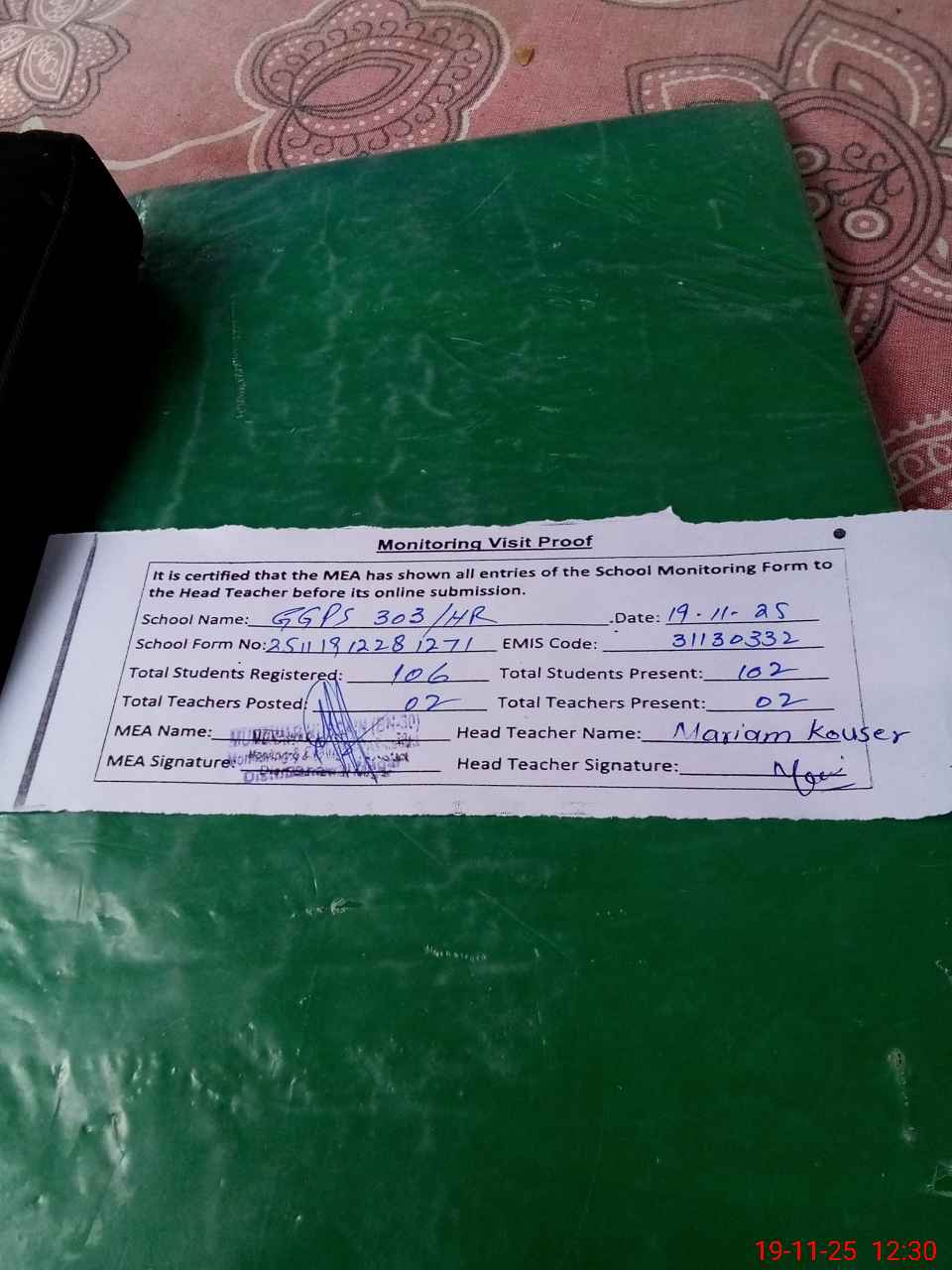 | Attendance Register | Head Teacher | MEA with School | Visit Proof |